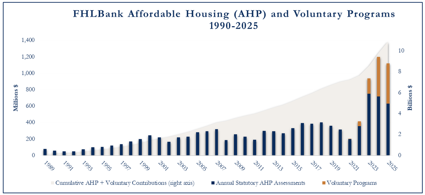 The 11 FHLBanks have a statutory mandate to set aside 10 percent of earnings to fund Affordable Housing Program (AHP) contributions. Although income was lower in 2025 compared to 2024, meaning AHP assessments declined modestly from $718 million to $632 million, 2025 AHP assessments still ranked as the third highest in the program’s history, going back to 1990.