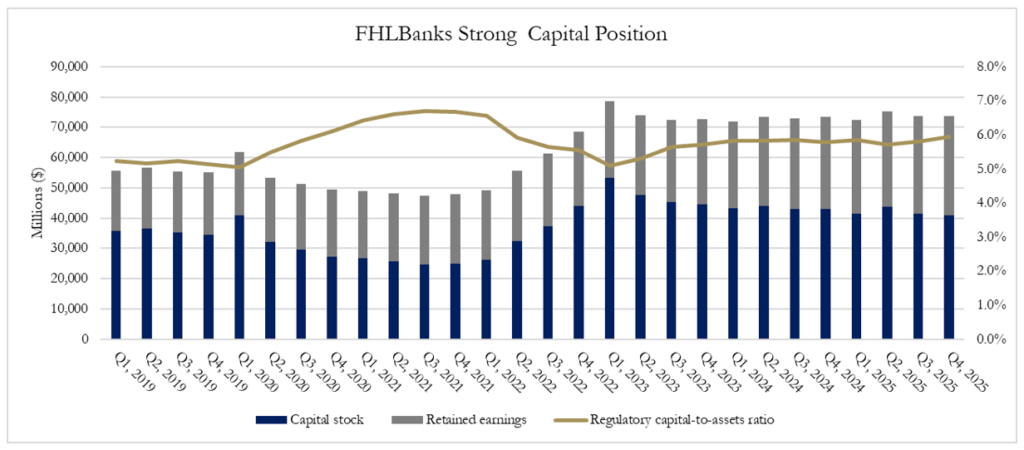 Net Income declined in 2025 in tandem with lower advance volumes over the course of the year (Figure 2). Advances are the primary collateralized lending vehicle offered by the FHLBanks, thus higher advance volumes generate higher income, and lower advance volumes generate lower income. Empirically, this relationship is strong, with advances and net income exhibiting a correlation coefficient above 0.8. But, while net income and advances declined, voluntary housing and community investment expenses increased, as did total capital, retained earnings, and the FHLBanks regulatory capital-to-assets ratio, shown Figure 4. These increases represent an investment in the future to ensure the FHLBanks are positioned to serve their members and their communities in any economic environment. In times of heightened uncertainty, the FHLBanks strengthened their capital buffers to provide confidence and assurance to members and the U.S. financial system that they will be there when they are needed, as they have been for nearly 100 years. At the end of 2025, the FHLBanks’ regulatory capital-to-assets ratio was the highest year-end level since 2021, reflecting the prudent risk management practices of executive teams across the System.[8]