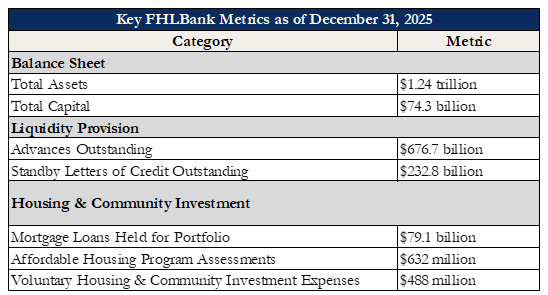 The Federal Home Loan Banks ended 2025 in a position of strength. Economic uncertainty prevailed throughout the year, spurred on in part by the longest government shutdown in history in the fourth quarter. Despite three interest rate cuts by the Federal Reserve in the fall,[1],[2], gross domestic product underperformed, falling below the 10-year and long-run average. Yet, in the face of these economic headwinds, the FHLBanks continued to deliver access to the reliable liquidity that has been a hallmark of the System for nearly 94 years, and ended the year with a solid foundation of capital for the years ahead.