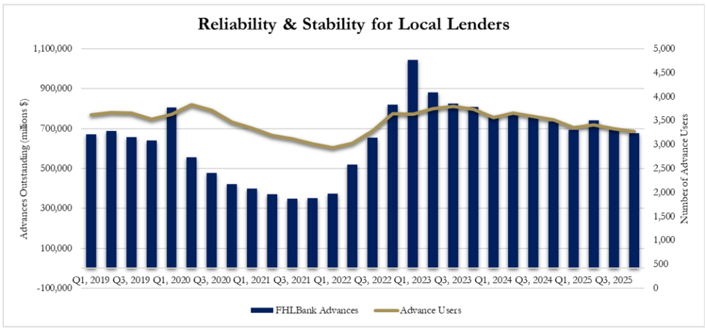 Each quarter, the FHLBanks Combined Financial Report lists the Top 10 Advance Holding Borrowers. This disclosure helps stakeholders assess and understand who the top users are and monitor advance concentrations. Figure 5 shows the dollar value and percentage share represented by the Top 10 Advance Holding Borrowers over the last decade. The Figure shows the percentage share of advances attributable to the top 10 borrowers reached a low point over the past decade at the end of 2025. While the dollar value of the top 10 users was not at an absolute low point in 2025, due to the unusually low advance levels in 2020 and 2021 when the U.S. financial system was flush with Covid stimulus relief funds, if those two anomalous years are excluded, 2025 was also a dollar value low point for the top 10 advance users over the past decade. Thus, at the end of 2025, a greater percentage share of advances, Systemwide, was going to and being utilized by a broader range of members, reflecting the breadth of advance utilization and the ABA survey finding that FHLBank advances are the most preferred source of collateralized borrowing by community, regional, and large national banks.[9]